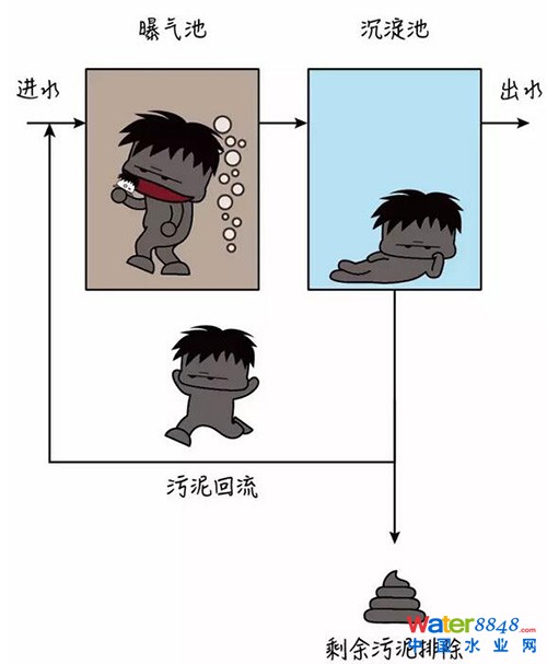 簡單總結(jié)一下活性污泥法的運(yùn)作過程,先在曝氣池吃飯,然后進(jìn)沉淀池睡覺,睡醒了就順著回流管跑回曝氣池接著吃,XXXX直接排掉